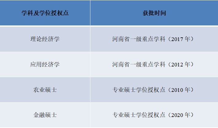 与本学位授权点相关的本科层级教育始于1958年郑州粮食学院建立的经济系,产业经济学硕士研究生(二级学位授权点)于2004年开始招生,2013年开始以应用经济学硕士一级学位授权点招生,2018年理论经济学硕士一级学位授权点开始招生;农业硕士(农业管理领域)2011年开始招生,金融硕士学位授权点2020年获批。