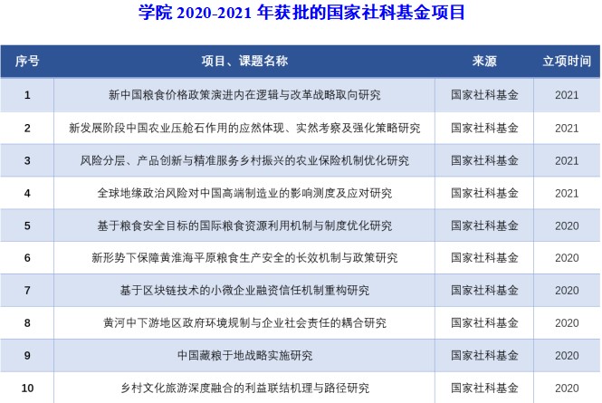 主要聚焦如下四个方面:(1)入主流聚前沿,学术影响日益彰显。研究不同金融业态下中小企业融资信任和风险缓释机制;较早提出中国粮食经济政策与内需变动匹配机理,孕育了粮食供给侧结构性改革的观点。近5年承担国家级项目23项,获省部级科研成果奖27项。(2)重交叉兴融合,粮食经济研究国内领先。利用多年积淀形成的粮食全产业链学科群优势,承担1993年世行贷款资助改善中国粮食流通项目、2002年关于粮食经济与内需变动的国家社科重点项目、粮食产业强国“十四五”规划预研课题等多项重大项目,为中国粮食流通和宏观调控体系构建做出了突出贡献。(3)建团队重服务,智库作用成效显著。拥有粮食、金融和新经济等领域的知名团队,粮食“三链同构”、跨境电商等多项成果被相关部委和省政府采纳,撰写编制咨询报告和规划78项。(4)高站位大视野,服务国际粮食安全合作。发挥粮食安全研究领域的优势地位,为93个国家培训50期高级粮食官员,编制柬埔寨等发展中国家农业园区规划和可行性报告12项。