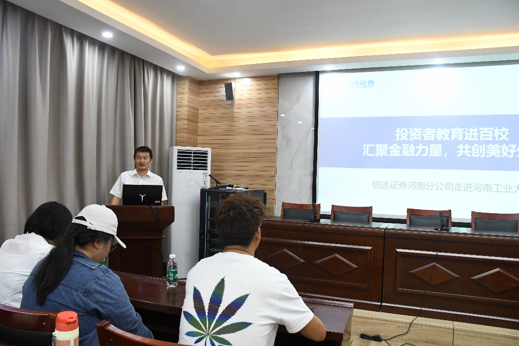 张福勇首先对信达证券河南分公司及其资深投资顾问宋彬作以简要介绍。随后,宋彬从证券的概念、资本市场的现状和风险等角度入手,普及了金融产品的相关知识,号召大家树立科学正确的投资观念;此外,为提高学生的防诈意识,宋彬运用丰富的案例和实际经验分析了当前常见的诈骗手段,引起了学生们的广泛关注和共鸣。最后,宋彬和同学们就金融投资与反诈防骗等相关问题进行了充分交流。