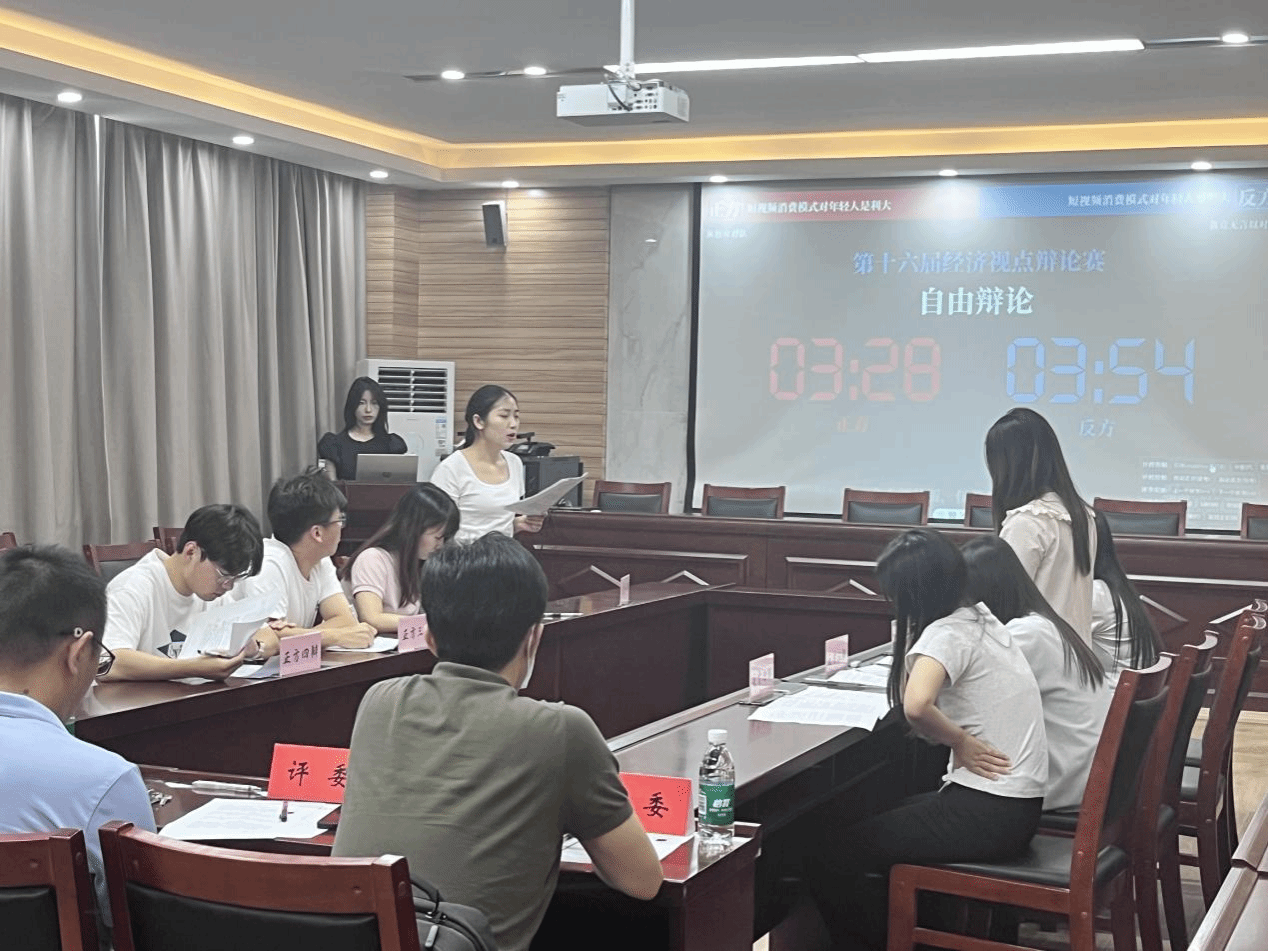 举办第十六届经济视点辩论赛,决赛于6月11日下午在3605会议室进行。本次赛事由金融学系支部书记刘变叶、财政学系支部书记郇新刚、经济学系支部书记何宇鹏、国际经济与贸易系副主任鲁慧鑫担任评委,辅导员何亚萍主持,第四十期入党积极分子参与本次赛事。