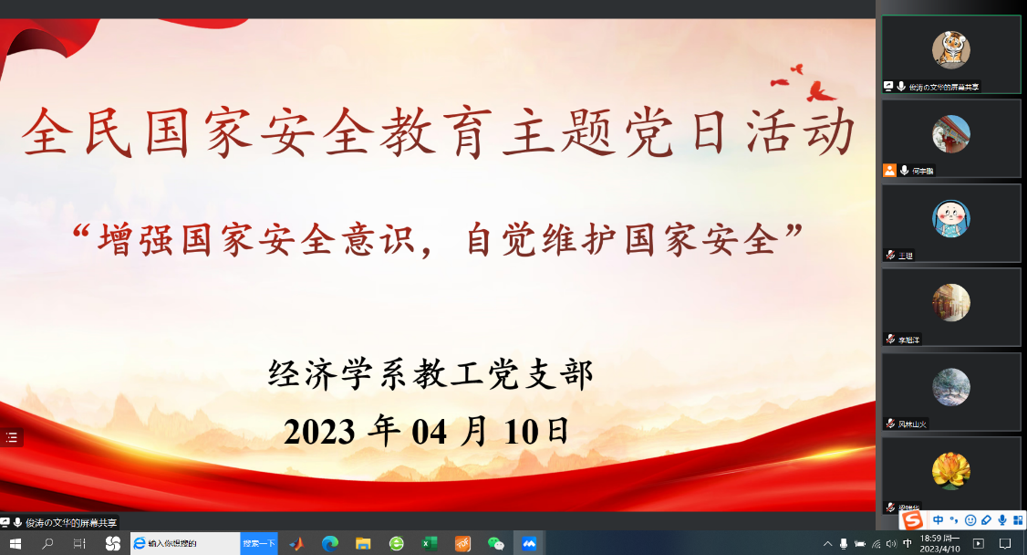 守护国家安全,护航民族复兴。为贯彻总体国家安全观,增强全民国家安全意识和素养,夯实以新安全格局保障新发展格局的社会基础,在第八个全民国家安全教育日来临之际,经济学系于4月10日晚上开展“全民国家安全教育”主题党日活动。系教工党支部全体党员参加。