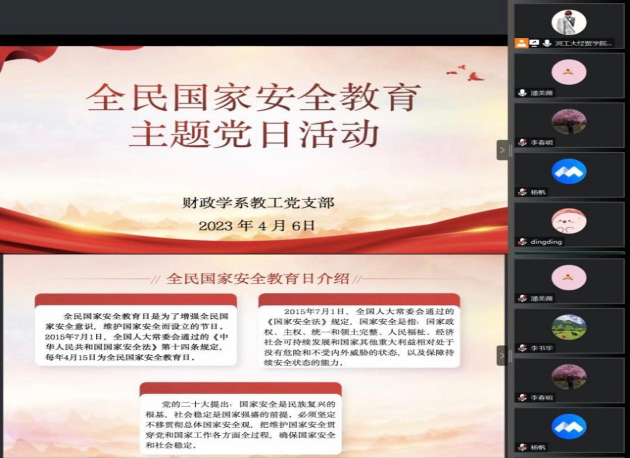 为迎接2023年4月15日全国第八个“全民国家安全教育日”,进一步推动国家安全宣传教育,4月6日晚上,财政学系教工党支部开展“贯彻总体国家安全观,增强全民国家安全意识和素养,夯实以新安全格局保障新发展格局的社会基础”主题党日活动。活动由财政学系教工党支部书记郇新刚主持,支部全体党员参加。