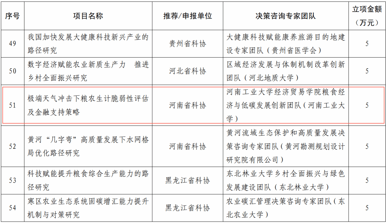 粮食经济与低碳发展团队获批中国科协2024年度决策咨询专家团队项目“极端天气冲击下粮农生计脆弱性评估及金融支持策略”。