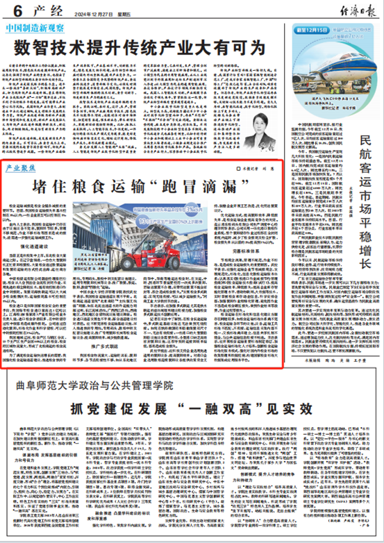 12月27日,《经济日报》以“堵住粮食运输跑冒滴漏”为题,就粮食运输减损问题采访我校李治教授,刊登了其在粮食运输减损领域的理论研究和学术观点。