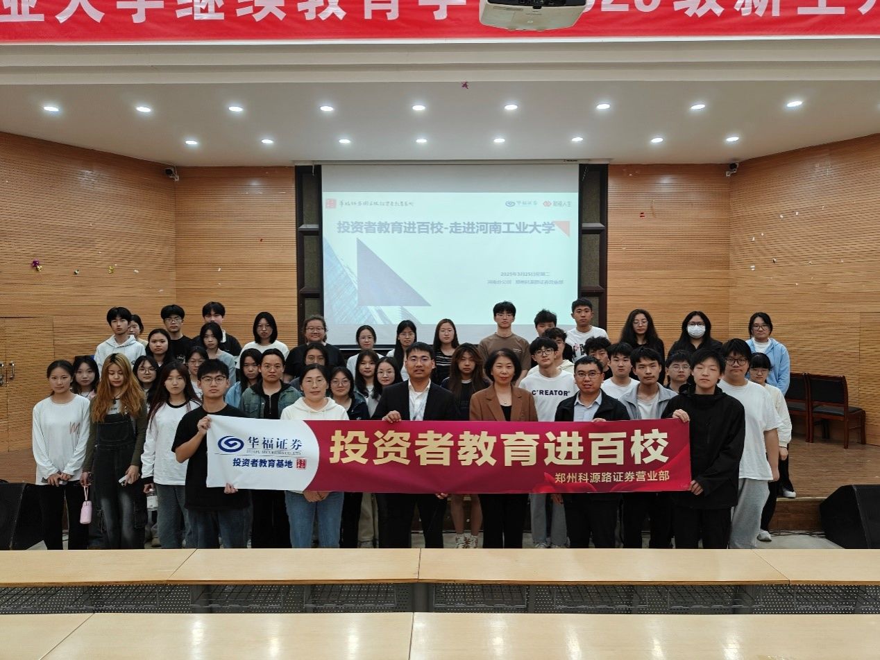 3月25日,华福证券郑州科源路营业部业务部副总监韩站等一行莅临河南工业大学嵩山路校区,为金融学专业大一学生开展了一场精彩的投资者教育讲座。华福证券郑州科源路营业部总经理傅跃云、财富顾问赵俊普、足球比分网站