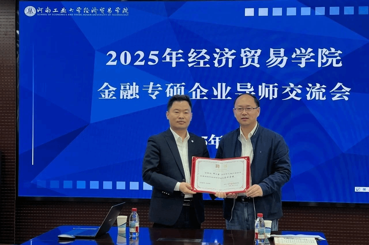 院长李文启为邱士建颁发聘书,对邱士建加入学院金融专硕企业导师队伍表示热烈欢迎与诚挚感谢,并期待校企协同育人迈入新阶段。