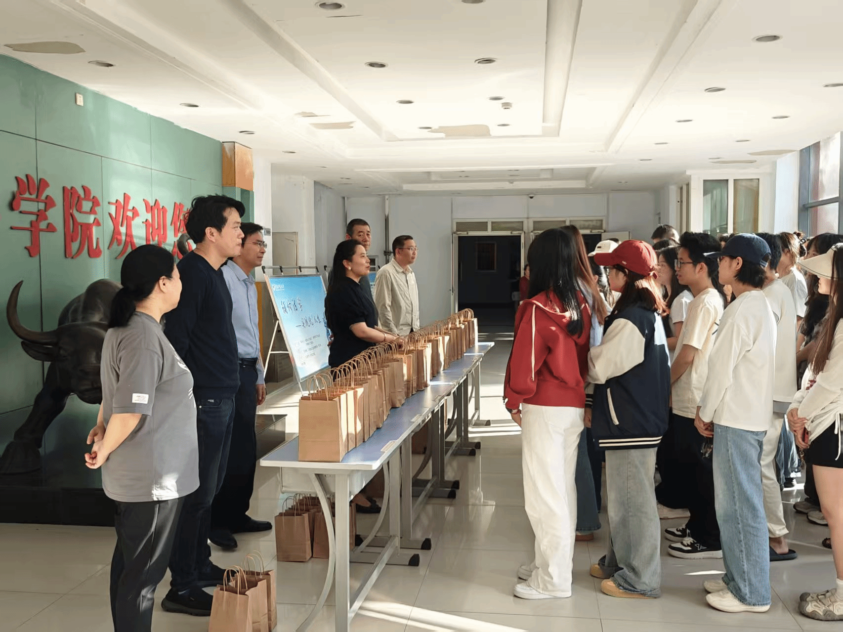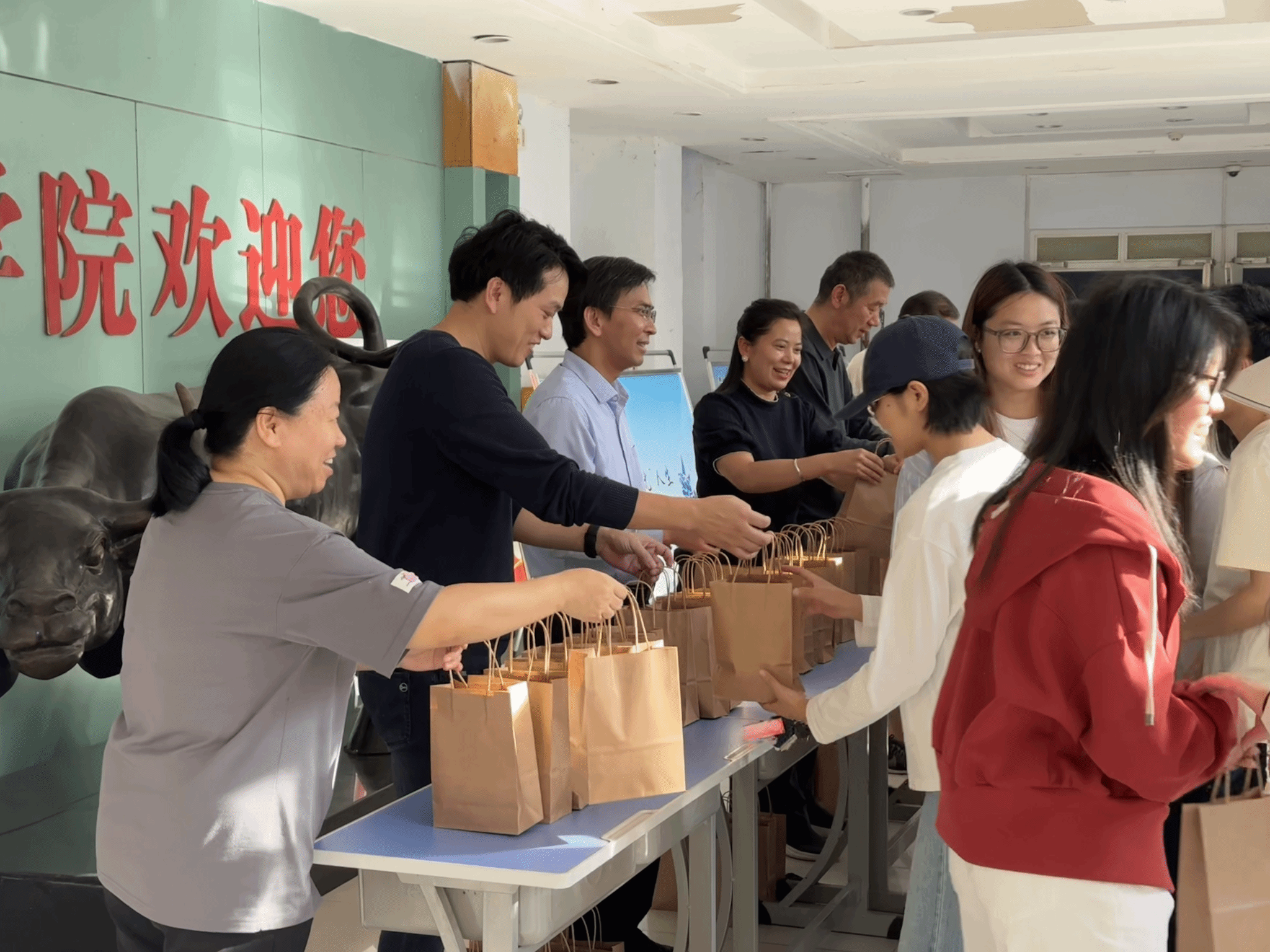 活动现场,学院领导与同学们亲切交流,不仅细致询问大家的学习进展与双节假期安排,更结合中秋节、国庆节点开展引导:中秋时可通过视频、电话向家人传祝福,国庆假期建议观看专题报道等,回望祖国发展、感受时代成就,将个人成长与国家发展相连。同时提醒假期出行、宿舍用电等安全事项,要求强化防范意识,确保假期平安有意义。随后,领导和老师们亲手为每一位学生递上暖心慰问品,现场秩序井然,欢声笑语不断,学子们接过礼包时的笑容里满是温暖与感动。