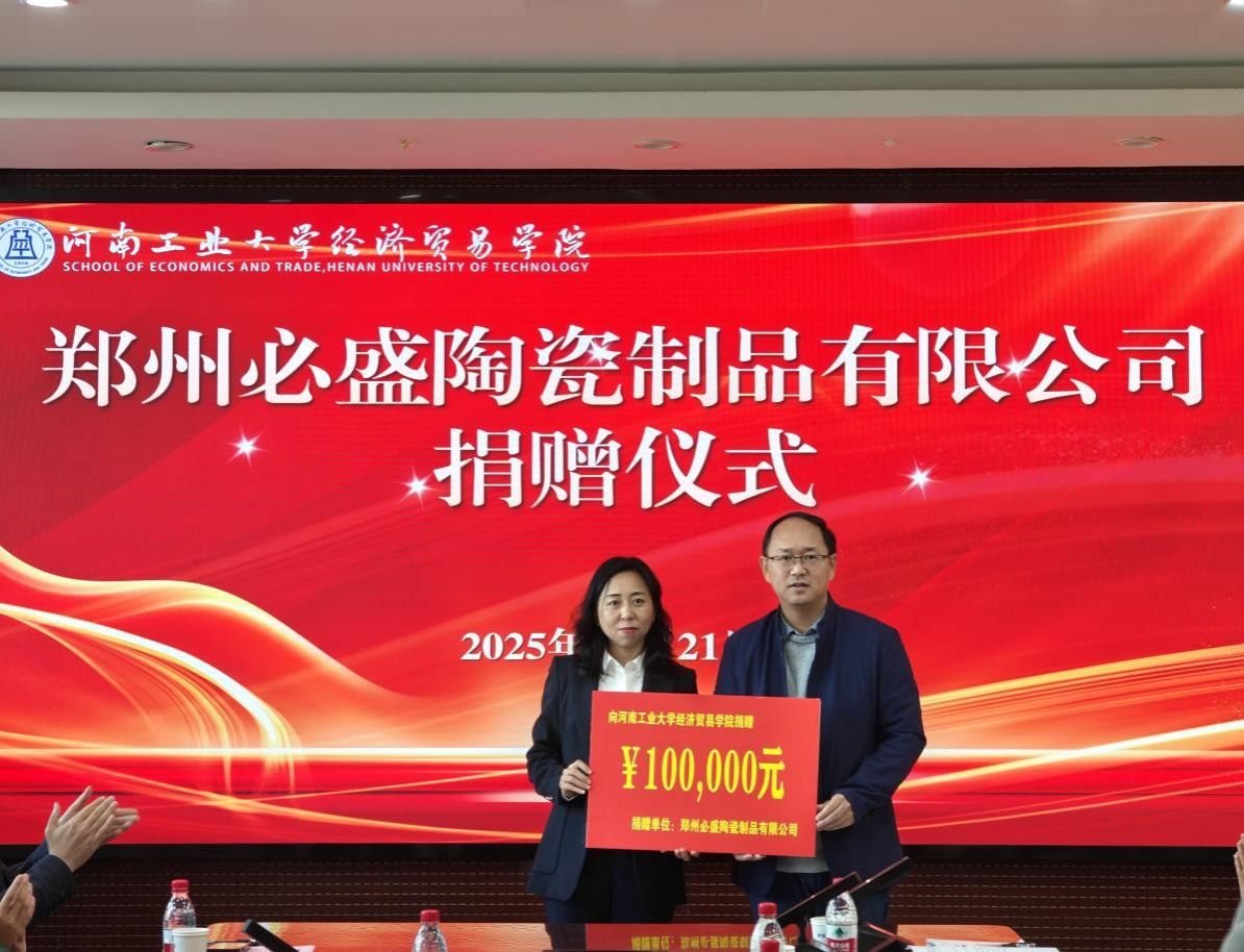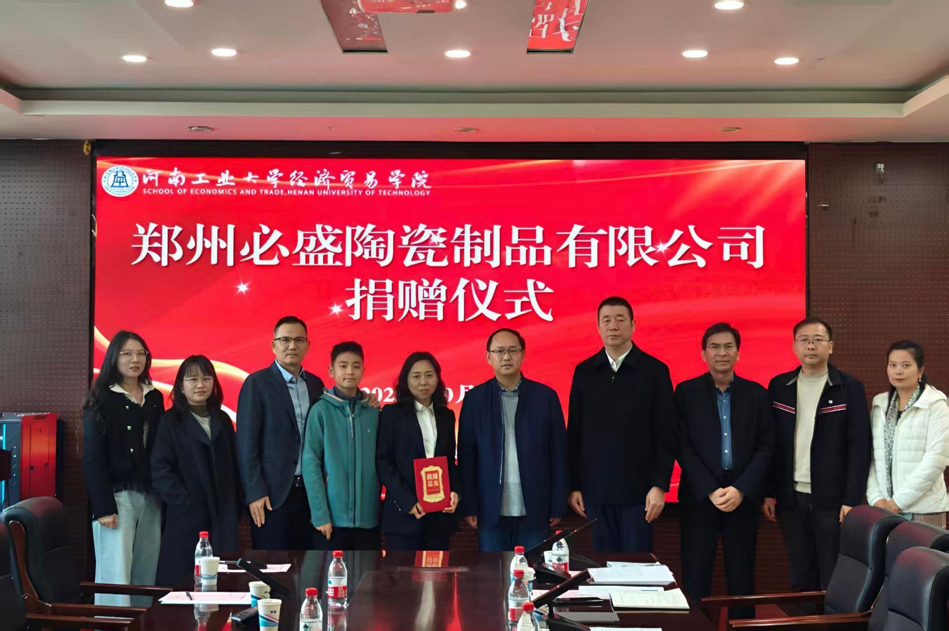 与郑州必盛陶瓷制品有限公司于博识楼3501会议室举行捐赠仪式。郑州必盛陶瓷制品有限公司总经理刘春燕、业务经理张娇娇、设计总监李佳雯、学院领导班子、全体中层及师生代表等出席仪式。仪式由院党委副书记岳鹏珍主持。
