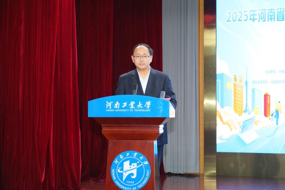 院长李文启主持,河南省高等教育学会副会长王天泽、河南工业大学副校长白艳红、河南新世纪拓普电子技术有限公司董事长秦秋霞、金智东博(北京)教育科技有限公司副总经理杜海军等嘉宾出席并致辞。王天泽表示,此次大赛既是落实国家“数字中国”战略与河南省“十大战略”的重要实践,也是深化高等教育改革、培养新质生产力的创新举措,希望本届赛事坚持“以赛促改、以赛促建、以赛促教、以赛促改学”,取得圆满成功。白艳红致辞指出,河南工业大学始终将“产教融合”作为人才培养的重要路径,通过“以赛促学、以赛促用”的模式不断提高创新人才培养质量,并对参赛选手提出期望,希望同学们在竞赛中勇于探索创新,在实践中锤炼品格,将个人成长融入中原崛起的时代洪流。秦秋霞致辞表示会通过技术支持持续推动金融教育数字化与智能化发展。杜海军表示很荣幸能为本次大赛提供平台支持与技术保障,助力学子在实战中提升金融素养。最后,河南工业大学谢书燃同学代表参赛学生发言,表示会严格遵守比赛纪律,赛出成绩,赛出风格。