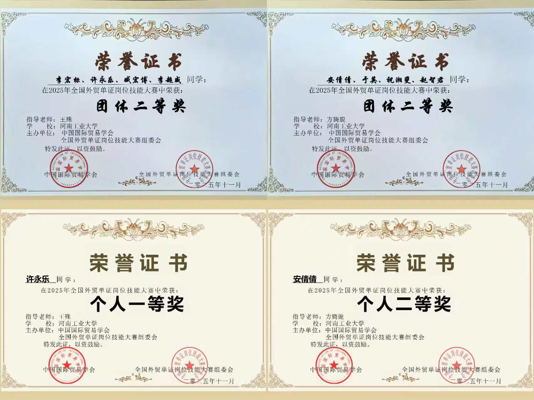 学子凭借扎实的专业能力与充分的赛前准备,在比赛中斩获多项荣誉。其中,“单证鬼才队”、“第一梯队”团队荣获全国团体二等奖,许永乐获个人一等奖,另有多支团队及同学分获团体三等奖与个人二、三等奖,王殊、方旖旎、王明涛、鲁慧鑫、张小蒙获评“优秀指导教师”。