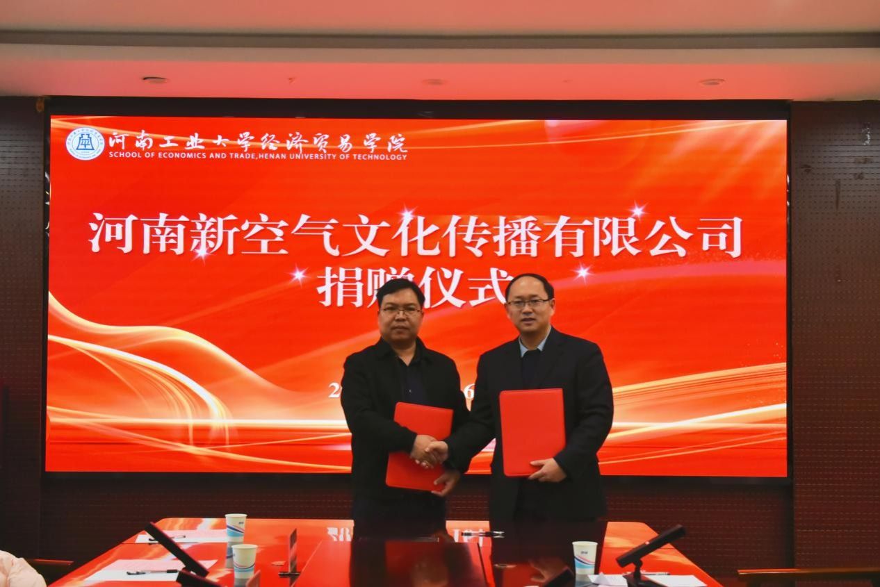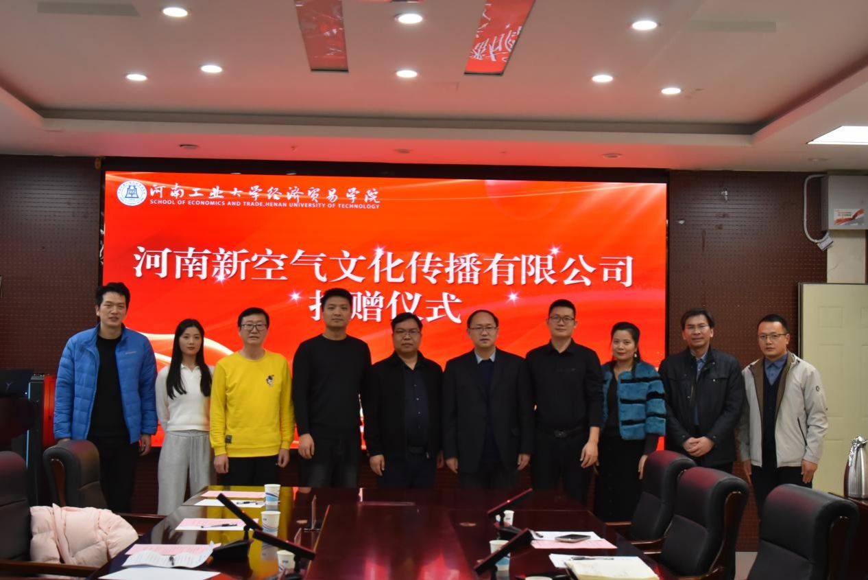 与河南新空气文化传播有限公司于博识楼3501会议室举行捐赠仪式。河南新空气文化传播有限公司董事长李建科、策划总监张胜威、行政总监刘多多,河南工业大学校友与基金工作办公室副主任王欣欣,学院领导班子、全体中层及师生代表等出席仪式。仪式由院党委副书记岳鹏珍主持。