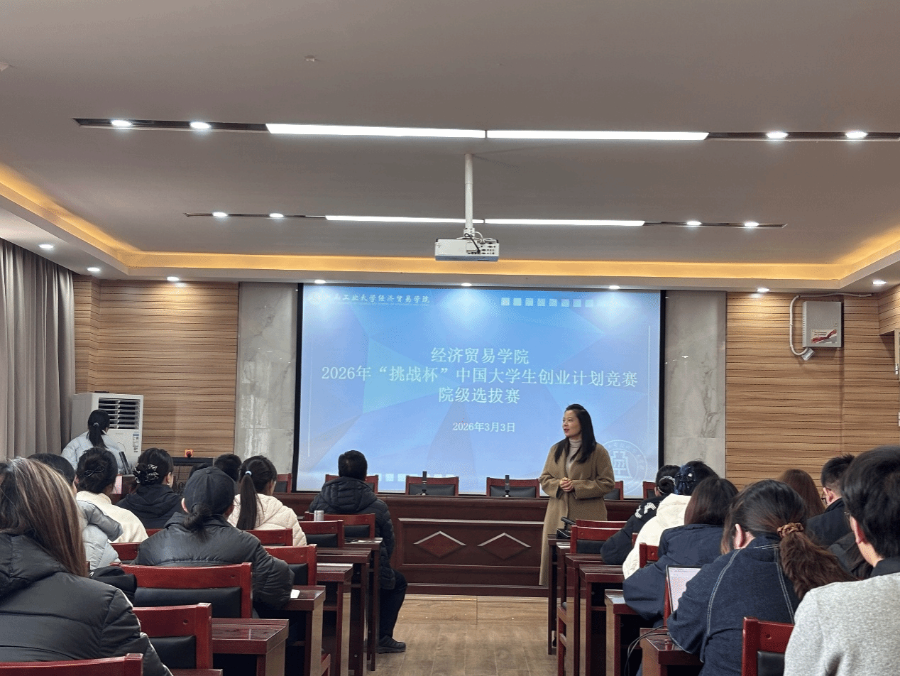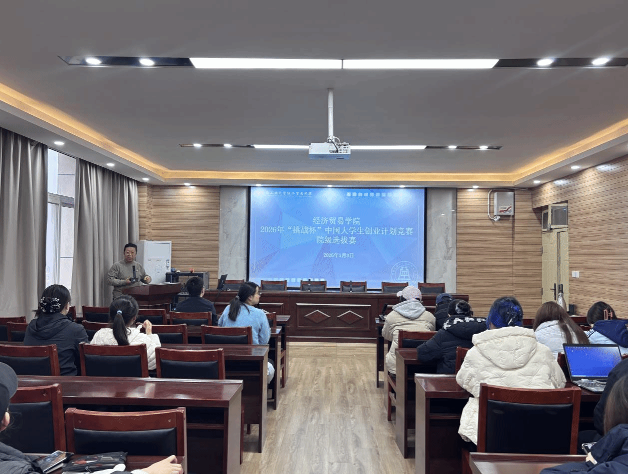 于博识楼3605会议室举行2026年“挑战杯”中国大学生创业计划竞赛院级选拔赛。学院党委副书记岳鹏珍出席活动并讲话,功勋导师翟书斌老师、优秀指导老师李治老师担任本次选拔赛评委,各参赛团队成员、学生代表共同参加本次活动。会议由学院团委书记王秋瑾主持。