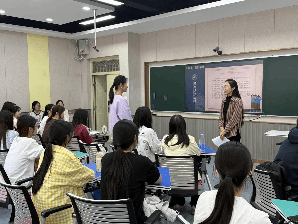 随后,课程围绕河南工业大学校史展开。张瑞玲带领同学们回望学校七十载实干兴校的发展征程,号召全体学员从厚重校史中凝聚奋进力量,脚踏实地、稳步前行,以自身优异成绩献礼学校七十周年华诞。解读校训内涵,领悟明德求是、拓新笃行的精神要义。