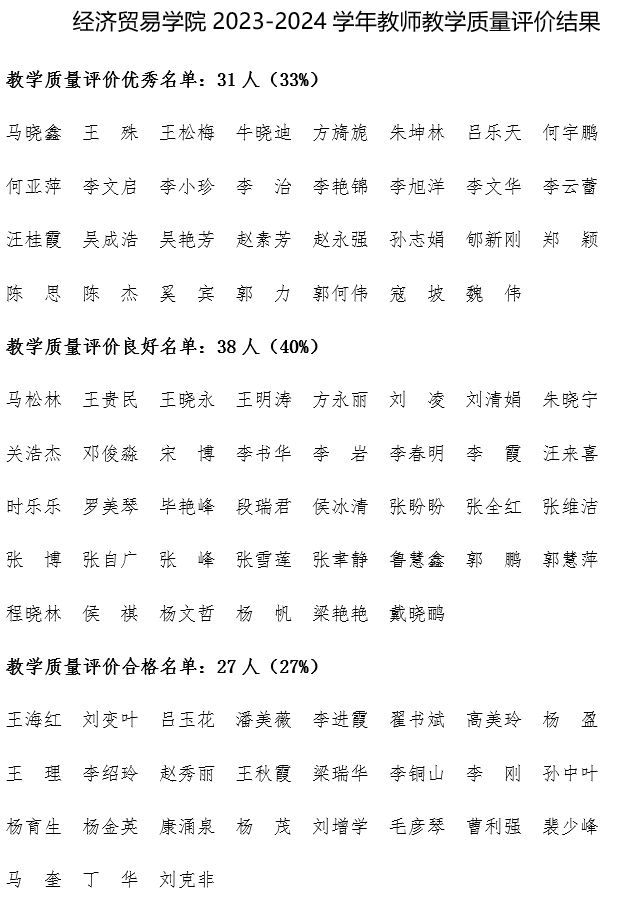 根据《河南工业大学教师教学质量评价的指导意见》(河工大政教〔2022〕8号)及《足球比分网站 教师教学质量评价实施办法》(院政发〔2024〕12号)文件要求,遵循客观、民主、公正的基本原则,学院对承担2023-2024学年教学任务的96位教师进行教学质量评价,现将教师教学质量评价结果予以公示。