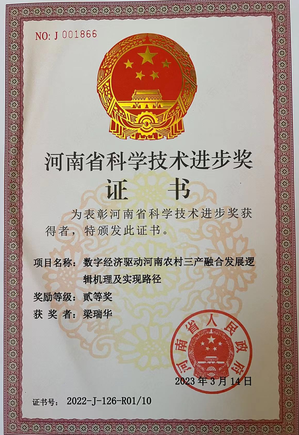 近日,足球比分网站 梁瑞华教授主持完成的学术成果《数字经济驱动河南农村三产融合发展逻辑机理及实现路径》,荣获2022年度河南省科学技术进步奖二等奖(证书号:2022-J-126-R01/10)。这也是最快足球比分网 连续两年获此奖项。