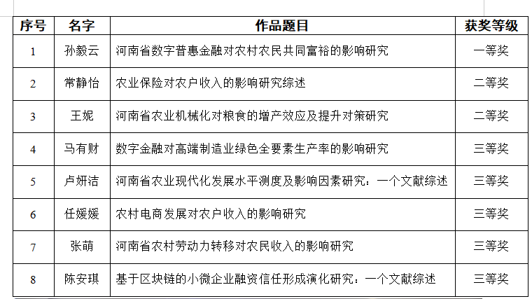 本届文献综述大赛于2023年6月份拉开帷幕,共计收到61份参赛作品。经过外审专家们的严格初评打分,其中8份作品脱颖而出,成功闯入决赛环节。在决赛答辩会上,各组同学在规定时间内分别就各自文献综述进行PPT个人展示和讲解。同时,评委老师从作品的创新性、可行性、内容以及现场答辩情况等方面进行提问并打分,并根据作品情况为后续的论文撰写提供建议。经角逐,《河南省数字普惠金融对农村农民共同富裕的影响研究》获得第一名,作品《农业保险对农户收入的影响研究综述》《河南省农业机械化对粮食的增产效应及提升对策研究》获得第二名,作品《数字金融对高端制造业绿色全要素生产率的影响研究》等5组获得第三名的优异成绩。