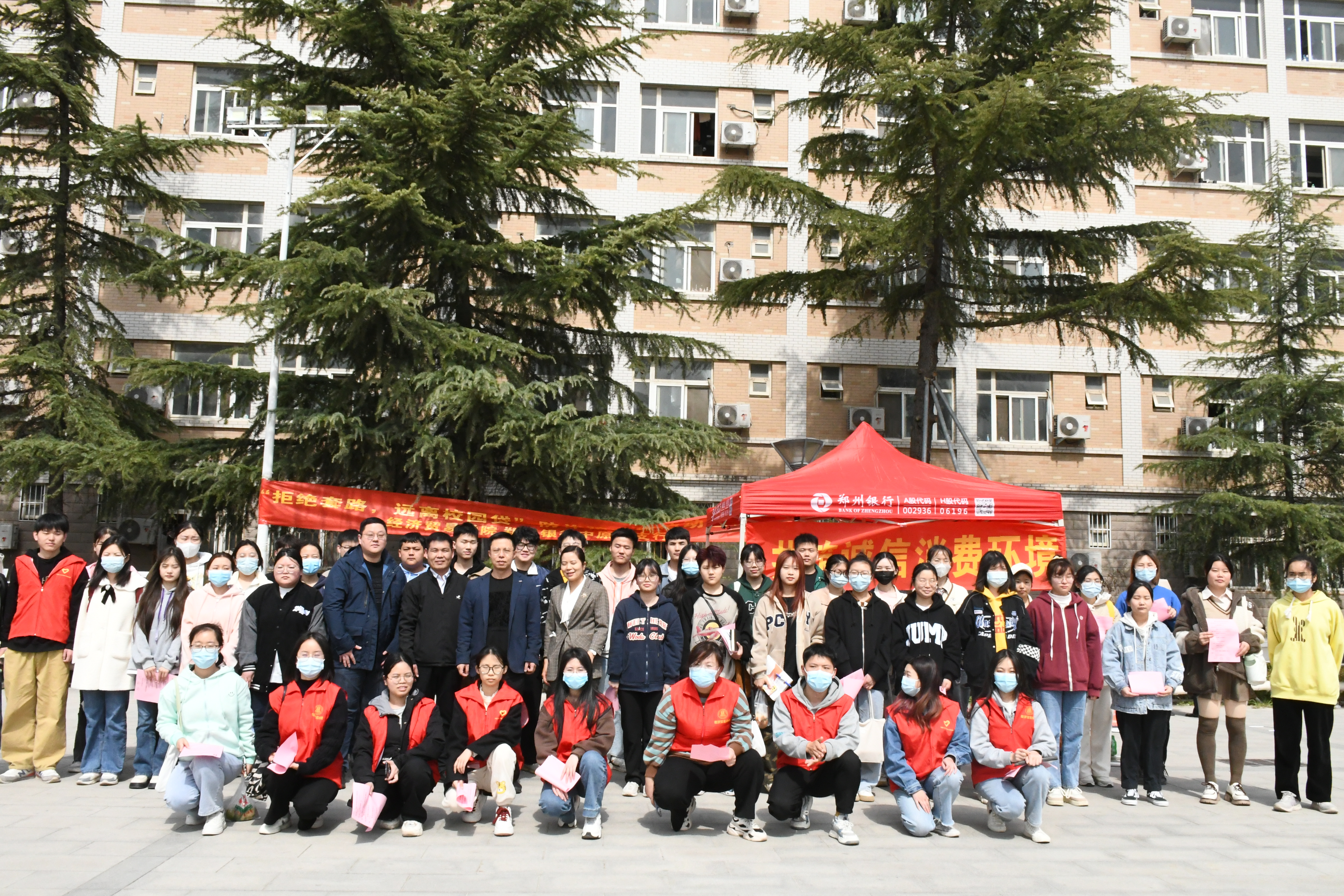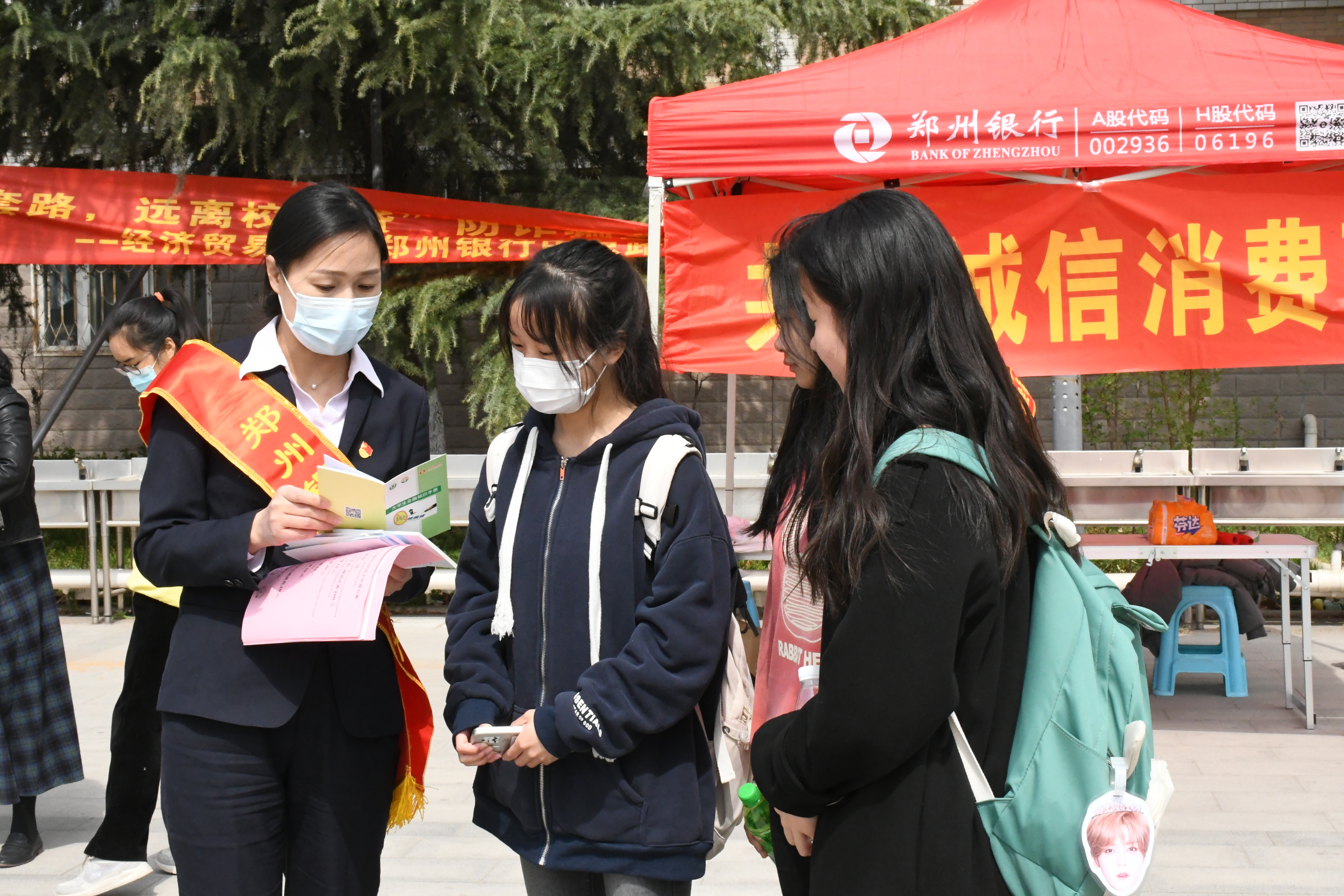 携手郑州银行中原路支行在钟楼广场开展了防诈、反诈志愿服务活动。郑州银行中原路支行行长贺冲等五名工作人员与学院志愿者们在现场进行反诈常识和防诈宣传。