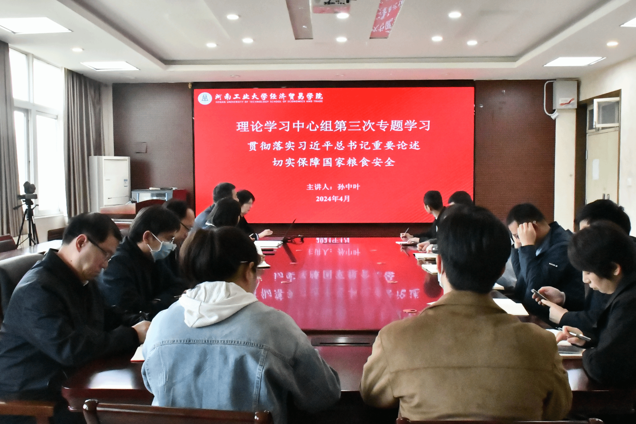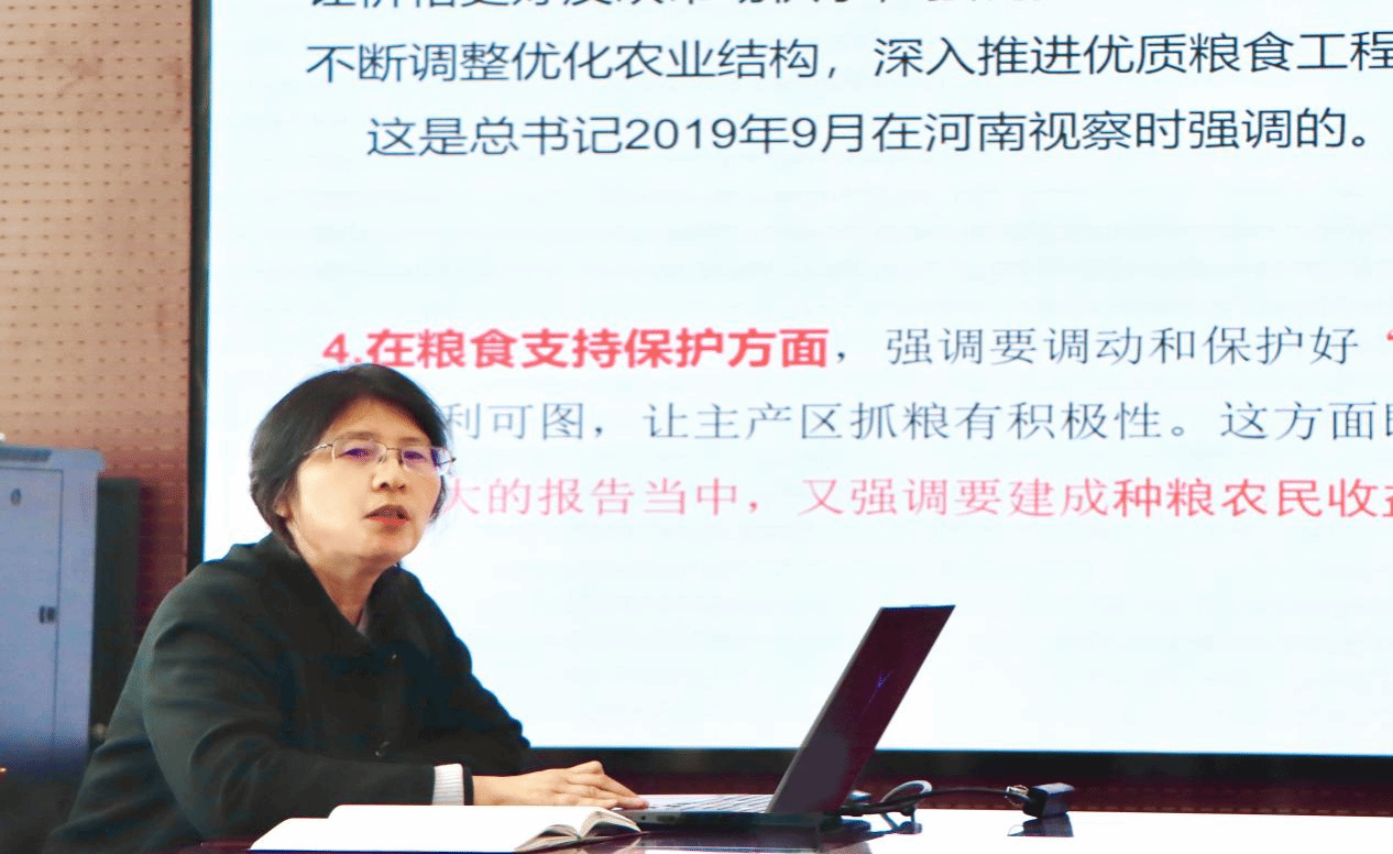 院长孙中叶以《贯彻落实习近平总书记重要论述,切实保障国家粮食安全》为题给全体干部作学习辅导报告。她从粮食安全的关键把握、战略定位、战略思想、战略举措、战略保障等五个方面,阐释了习近平总书记关于国家粮食安全重要论述的丰富内涵与实践要求。最后,孙中叶结合学院发展实际,对干部党员学习贯彻习近平关于国家粮食安全重要论述提出了具体要求,一是要将习近平总书记关于国家粮食安全重要论述的学习走深走实,做到真学深悟,深刻领悟其蕴含的核心要义。二是要将习近平总书记关于国家粮食安全重要论述的实践要求融入对粮食安全和粮食经济的深入研究之中,力争尽快取得标志性成果,发挥好对学校“双一流”创建的支撑作用。三是要将学习习近平总书记关于国家粮食安全重要论述的成果切实转化为学科建设、课程建设、团队建设、科学研究、思政育人的有效措施,持续推动学院内涵建设和高质量发展。
