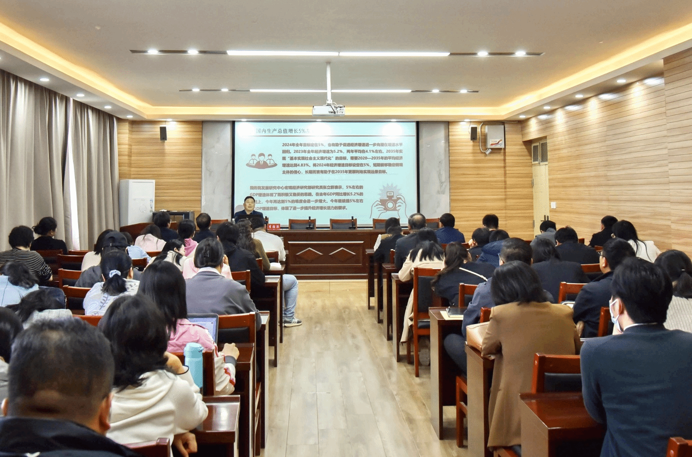 李海涛以“2024年‘两会’精神主要内容和热点解读”为题,围绕两会来龙去脉、两会热点重点聚焦、习近平两会讲话精神等三个方面,深度剖析了全国两会的精神内涵。首先,他介绍了两会概况,从国内生产总值、居民消费价格涨幅、城市新增就业等方面回顾了2023年工作整体情况,解读了2024年经济社会发展总体要求和政策取向以及2024年政府工作任务;通过9个“两会热词”聚焦两会热点重点;并从发展新质生产力、助力中国式现代化和全面提升新兴领域战略能力等三个方面对习近平两会讲话精神进行详细阐述。报告会主题鲜明、重点突出、内容丰富,使教职工对全国两会精神有了更深的理解和感悟。