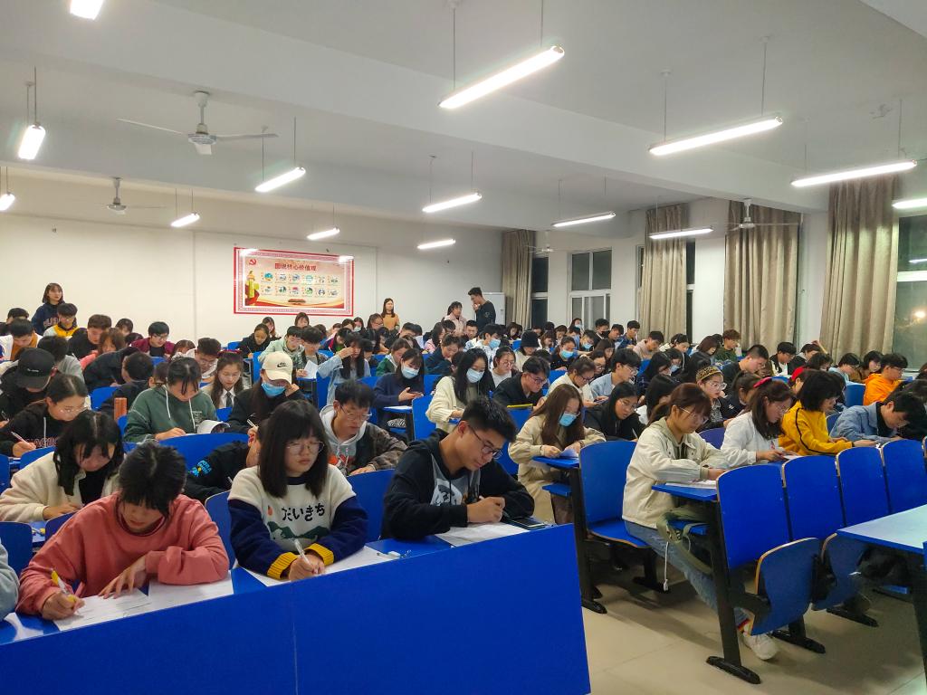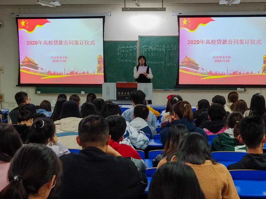 在3209教室开展2020年高校贷款合同签订仪式暨感恩励志教育大会。2017级辅导员王秋瑾、院生活部成员及申请高校贷款同学参加本次会议。