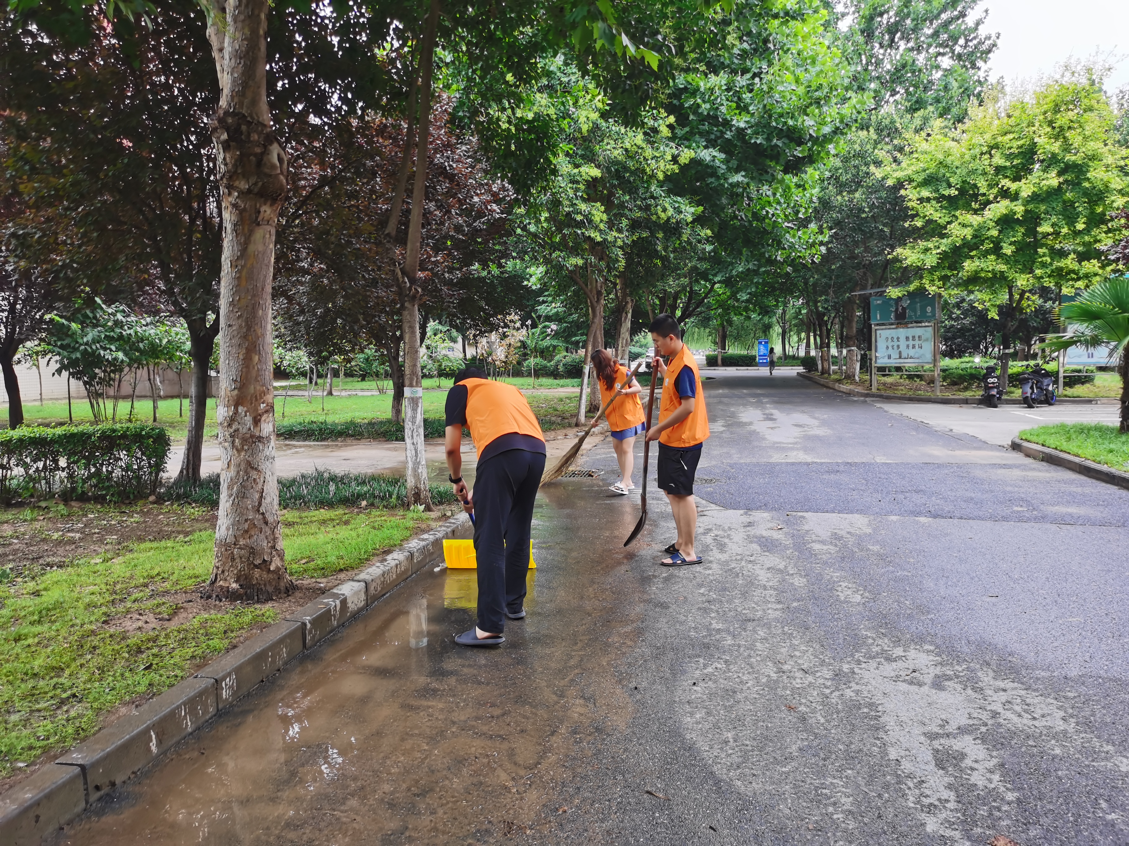 7月23日上午9时,暴雨的持续影响减弱,在确保出行安全及风险可控的前提下,学院老师带领学生党员志愿者清扫路面积水与淤泥,清理杂物并放置垃圾桶,为受灾后的校园恢复工作贡献力量。