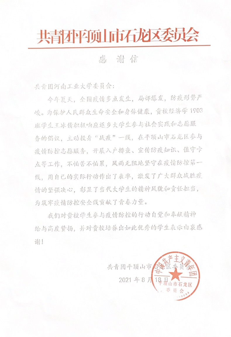 近日,学院收到一份来自共青团平顶山市石龙区委员会的感谢信,信中对王冰倩同学在社区防疫工作中做出的突出贡献表示感谢。信中写到王冰倩同学积极响应返乡大学生参与社会实践和志愿服务的倡议,第一时间报名参加了疫情防控志愿服务,出色地完成了入户排查、宣传防疫知识、值守卡点等工作。不怕苦,不喊累,风雨无阻地坚守在疫情防控第一线,彰显了最快足球比分网