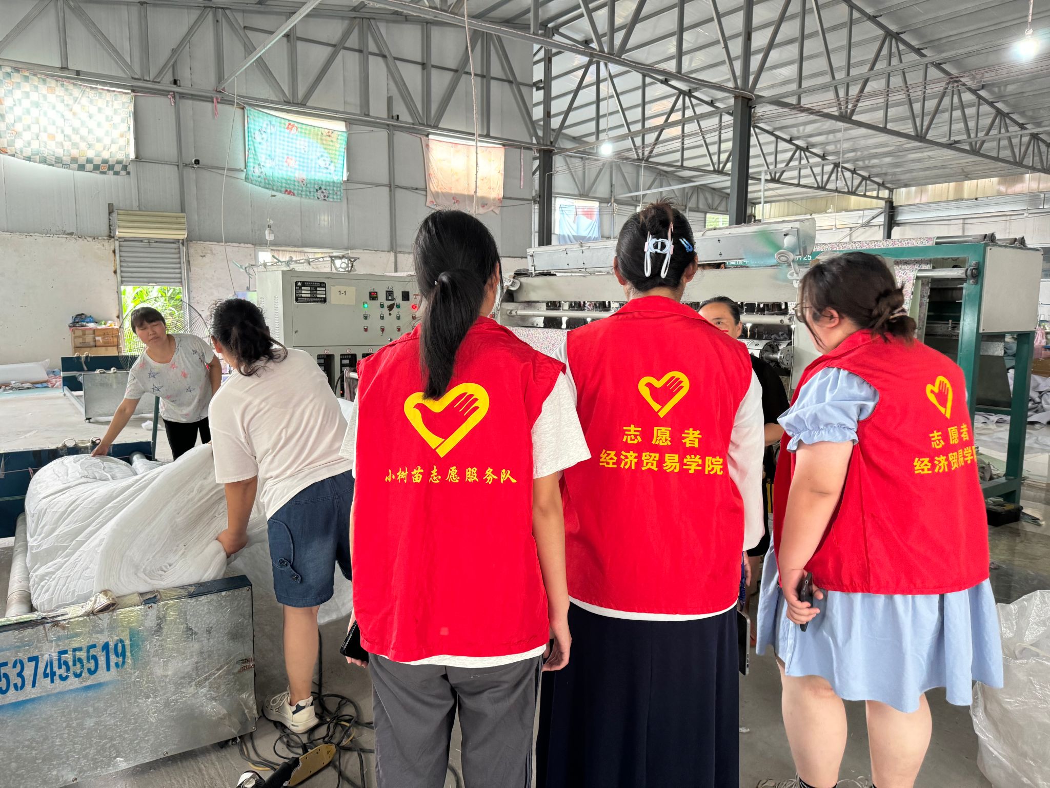 7月7日上午,团队成员一行来到许昌市建安区张宋村进行参观学习。张宋村以香油、纺织产业出名,这两大产业为其带来巨大的收益的同时也解决了部分村民尤其是妇女的就业问题。为了切实了解张宋村的发展成果,实践团队成员们进入纺织加工厂进行实地参观,详细观看了布料的加工过程,切实感受发到了产业振兴给农村发展带来的巨大作用。