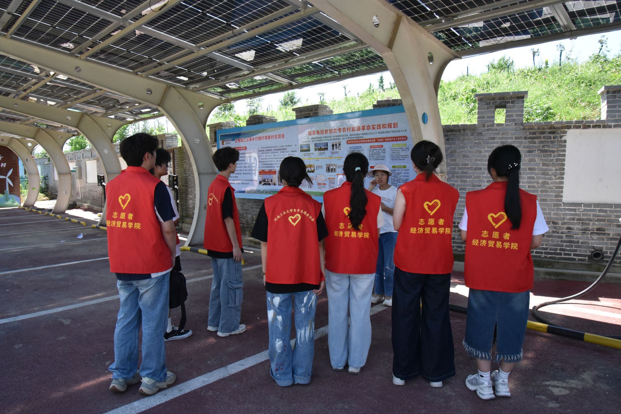 抵达付楼村后,村容村貌的规整令团队成员眼前一亮:清洁能源设施巧妙融入乡村图景,屋舍错落有致,休闲区域配套完善,为村民生活增添了不少色彩。在付楼村工作人员的引导下,团队成员乘坐光伏动力观光车,对村内的新能源设施及相关产业布局进行了实地考察。调研过程中,工作人员围绕付楼村作为零碳乡村首批试点的建设情况,详细介绍了新能源产业的发展模式。实践团深入了解了坑塘经济、光伏发电、风力发电等新能源相关动力来源及发展方式,探索了乡村振兴的路径,也体会到了村民们在付楼村发展中的拼搏与收获。