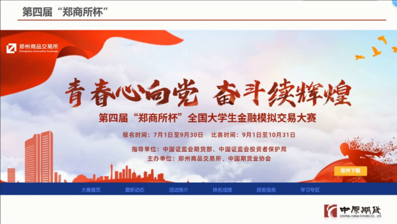 为了提高学生对期货知识的了解,丰富学生的知识素养。河南工业大学在郑州商品交易所的支持下,于9月17日通过直播的形式举办期货知识讲座暨第四届“郑商所杯”的宣传活动。本次讲座由豫新投资衍生品部负责人陈亚中、北京中金量化科技投资有限公司创始人高健主持,河南工业大学学生共同参加。
