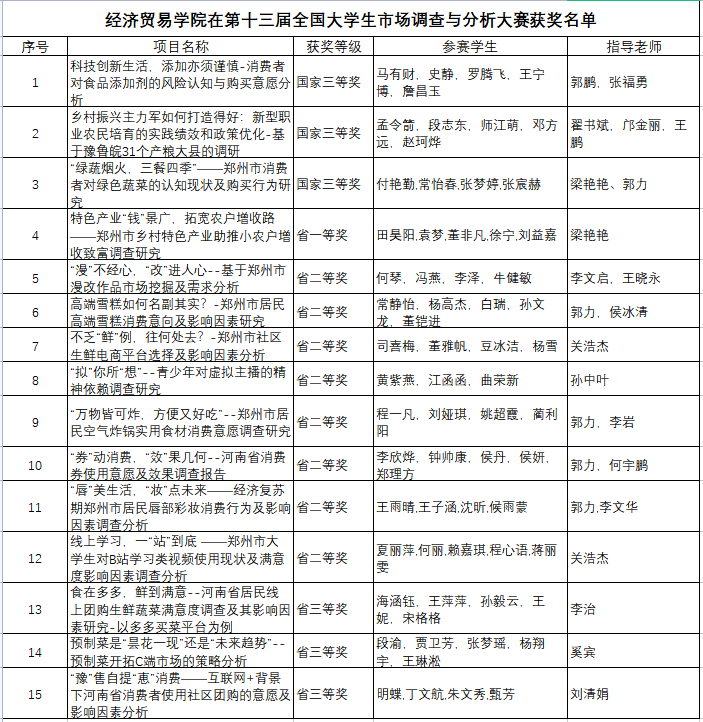 本科生和研究生共计15支队伍从全国参赛大学生中脱颖而出,分别获得国赛三等奖三项、省赛一等奖一项、省赛二等奖八项、省赛三等奖三项。其中,由郭鹏、张福勇两位老师共同指导的作品《科技创新生活,添加亦须谨慎——消费者对食品添加剂的风险认知与购买意愿分析》,由翟书斌、邝金丽及王鹏三位老师指导的《乡村振兴主力军如何打造得好:新型职业农民培育的实践绩效和政策优化——基于豫鲁皖31个产粮大县的调研》以及由梁艳艳、郭力老师指导的《“绿蔬烟火,三餐四季”——郑州市消费者对绿色蔬菜的认知现状及购买行为研究》分别获得国赛三等奖。