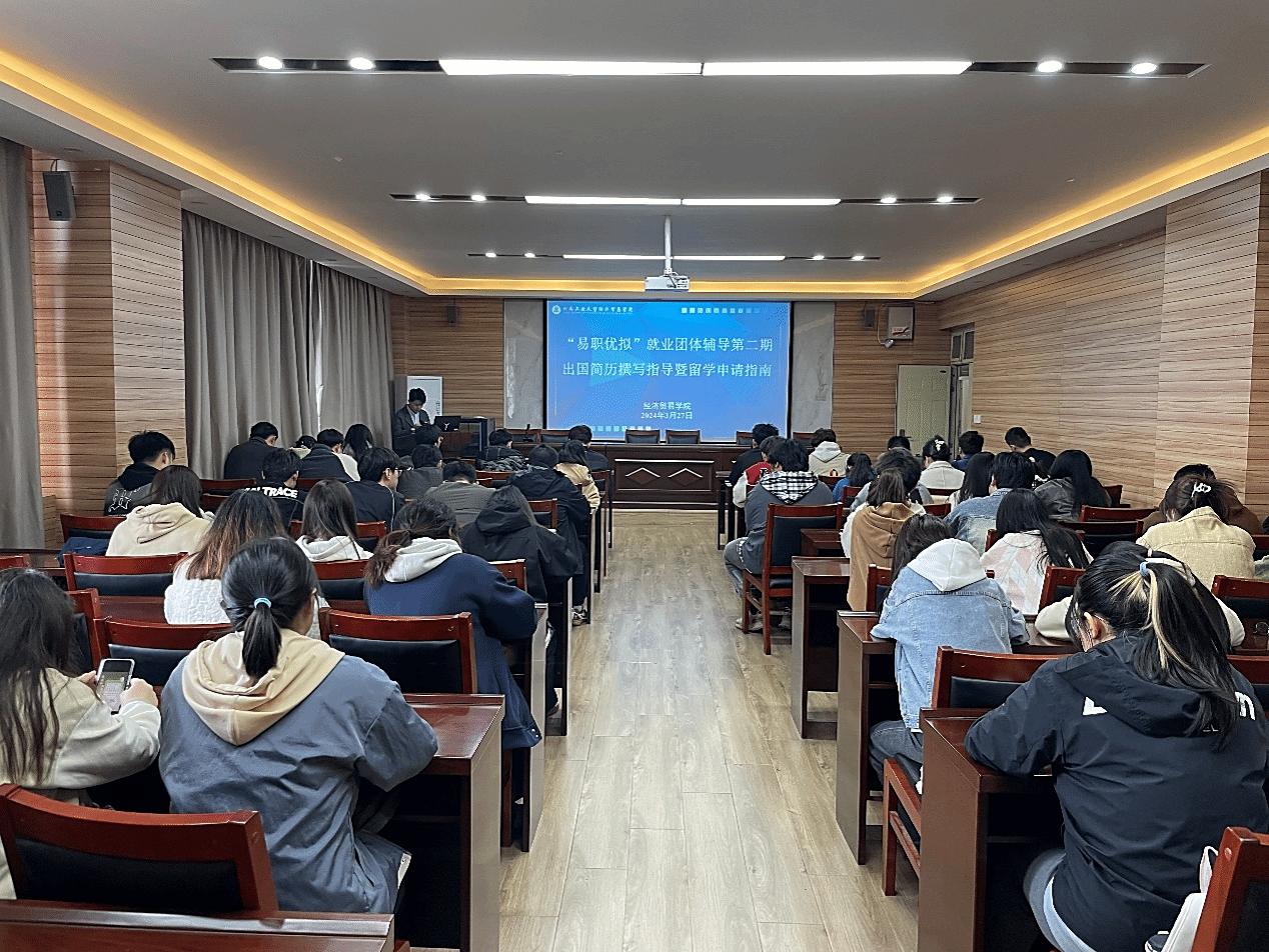在博识楼3605会议室举办以出国留学服务、简历撰写辅导为主题的专场讲座。本次讲座邀请到了内蒙古逸洋留学有限公司总经理莎日娜担任主讲嘉宾、运营总监狄鑫做简历指导。活动吸引了众多在校学生的积极参与,现场气氛热烈。
