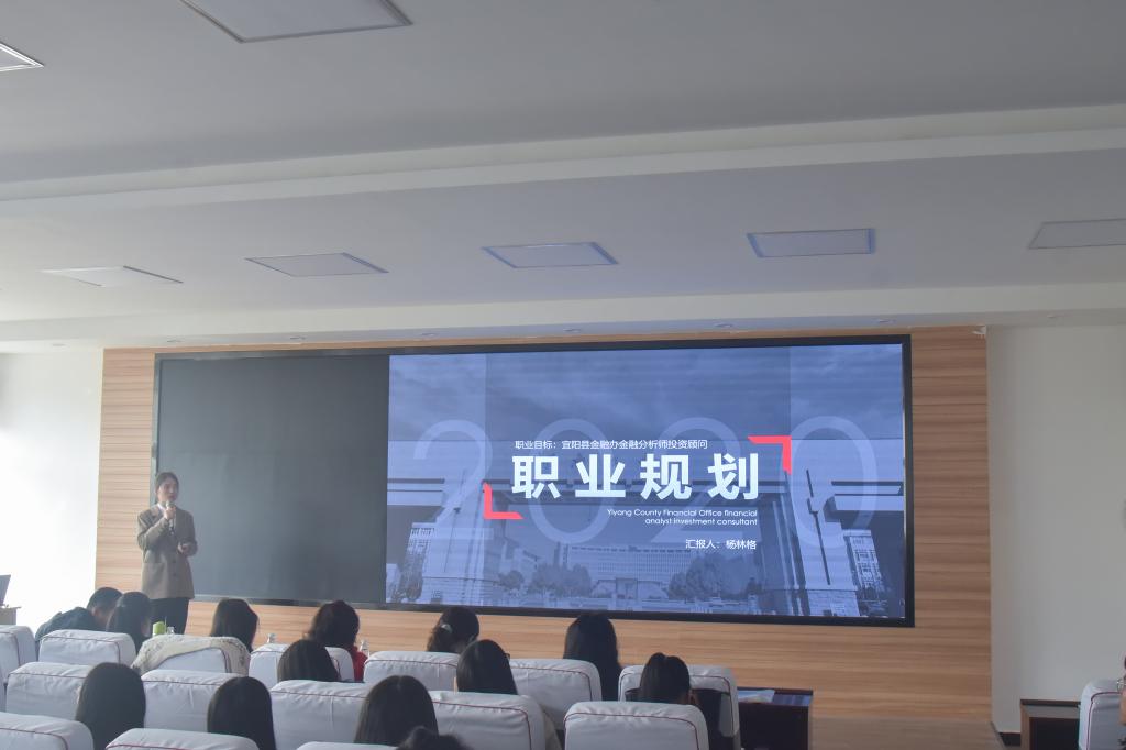 杨林格、王佳欣、李婕妤三位同学在比赛中谈吐大方、举止得体,分别从自我介绍、职业认知、就业环境和未来规划等方面对金融分析师、寿险精算师、黄淮学院区域经济学教师三个职业进行了介绍,给在场所有人留下了深刻的印象。每位同学介绍完毕后,评委老师们针对他们的职业规划提出了相关问题并给予建议,使前来参赛的同学对自己的职业规划有了更加清楚的认识。
