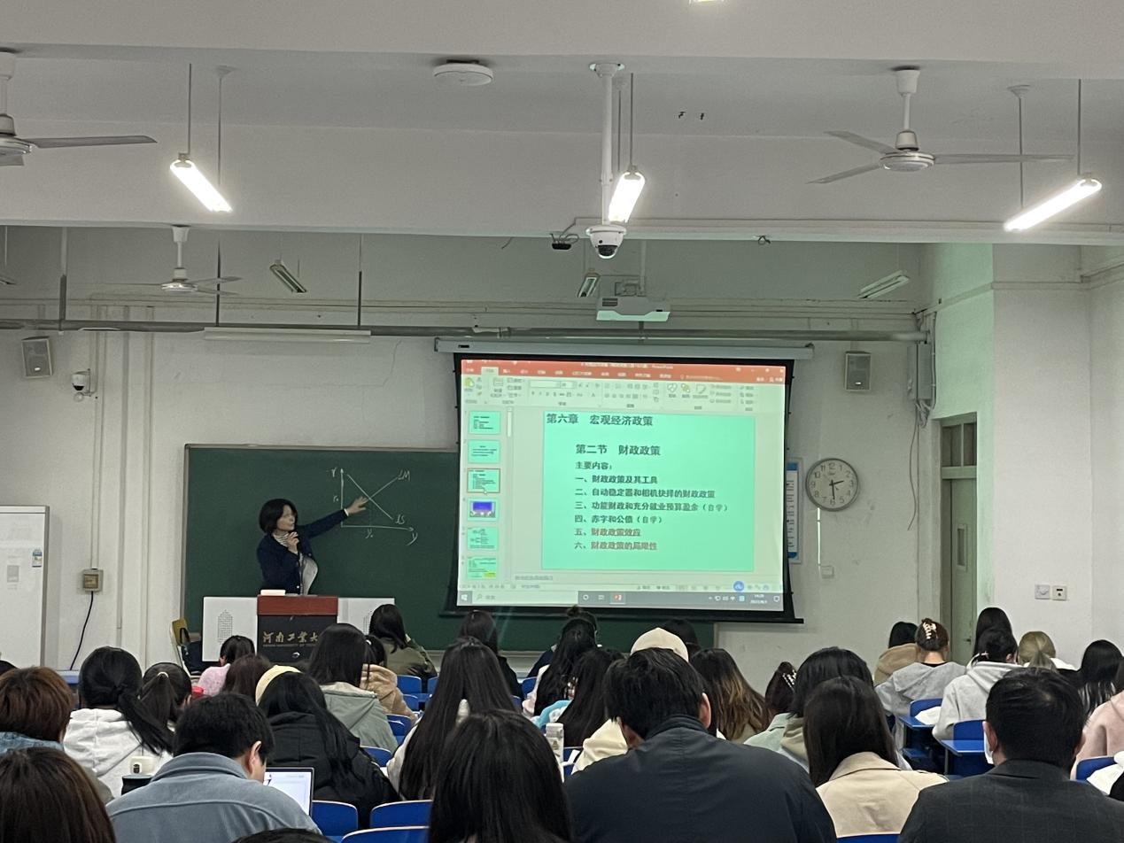 经济学系王松梅为河南省一流本科课程负责人、河南省教学标兵,本学期主讲《宏观经济学》。上课开始,她首先带领学生回顾前期所学知识点,用学生熟悉的知识点引出本节课所要讲的内容,即《宏观经济学》第六章第二节财政政策,主要讲述了财政政策的效应和局限性。随后,她对不同学派对财政政策“挤出效应”的不同观点进行讲解,为学生进行理论的拓展,与学生进行互动,让学生深度参与课堂。