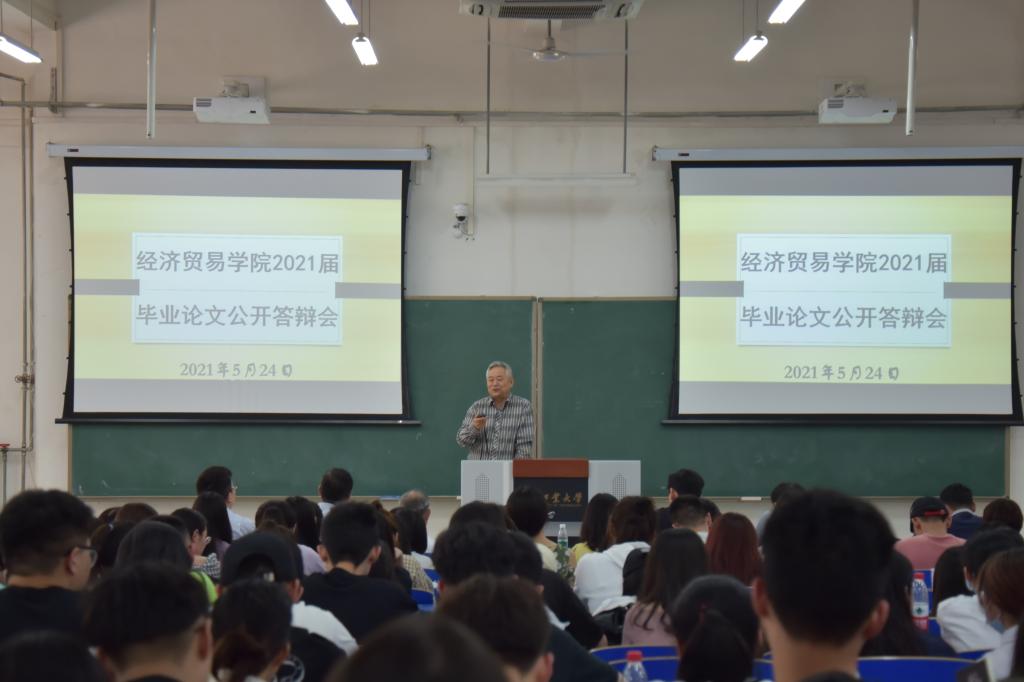 公开答辩,严把质量。为了充分展现经贸学子风采并严把毕业论文质量关,学院从各专业推荐的优秀学生中选取了5名同学(陈亚茹、李婕妤、吕明慧、赵景、梁欣捷)参加公开答辩会。公开答辩小组的答辩委员包括4位专业答辩老师(康涌泉、李春明、马松林、奚宾)和4位英语答辩老师(郭力、杨帆、张博、程晓林)。答辩过程中,5位同学结合PPT详细介绍了论文的选题背景、研究意义、研究思路、主要结论、创新和不足之处,并准确地回答了答辩老师提出的问题,得到答辩老师的一致肯定。接着,李怀西对本次公开答辩会进行了精彩点评。他认为,论文选题更接地气,能够紧扣国家和区域层面的重点问题和热点问题;研究方法更加科学,结论更加切合实际,相比往年有了很大提升。