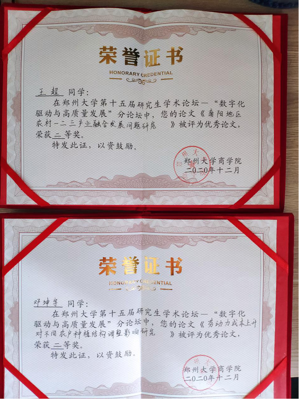 鼓励学生积极参加。经贸学子邓坤宇《劳动力成本上升对不同农户种植结构调整影响研究》,王超《南阳地区农村一二三产业融合发展问题研究》两部作品获得二等奖;韩亚心、李玉莹、闫晓茹、陈杨四位同学的作品获得优秀奖。