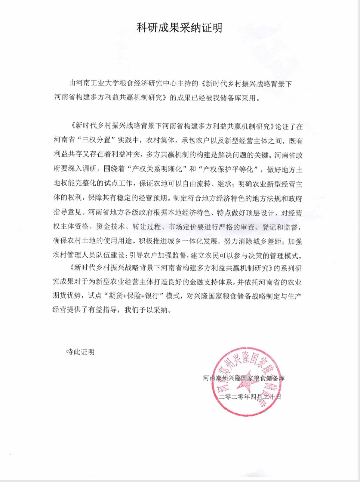 科技成果采纳证明——新时代乡村振兴战略背景下河南省构建多方利益共赢机制研究