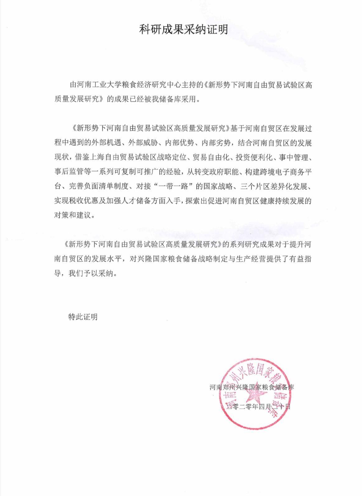 科技成果采纳证明——新形势下河南自由贸易试验区高质量发展研究